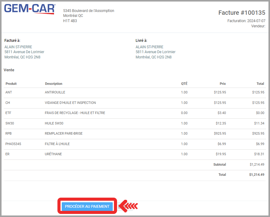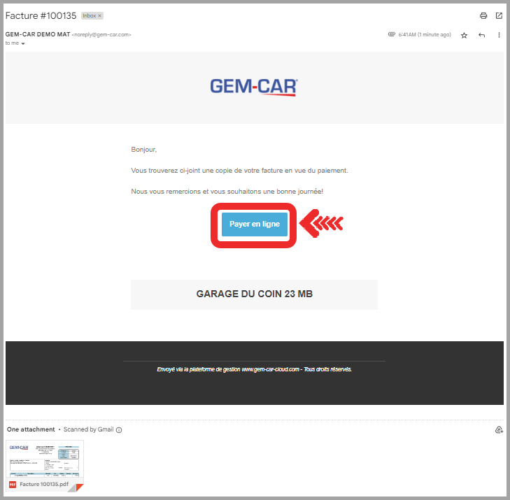Depuis le courriel, le client clique sur Payer en ligne > Procéder au paiement et saisit manuellement les informations de sa carte bancaire.