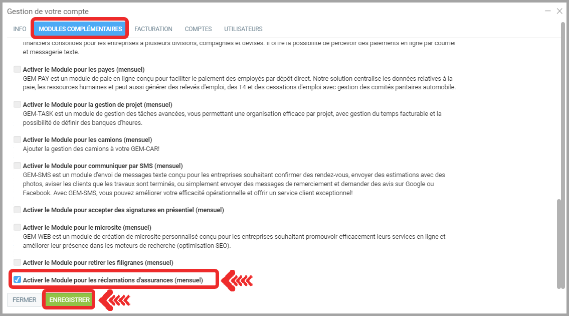 Sélectionnez Activer le Module pour les réclamations d'assurances (mensuel).