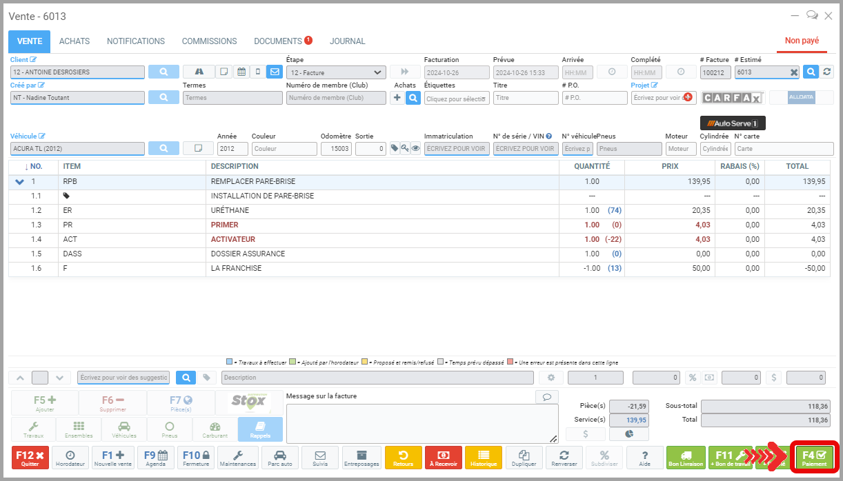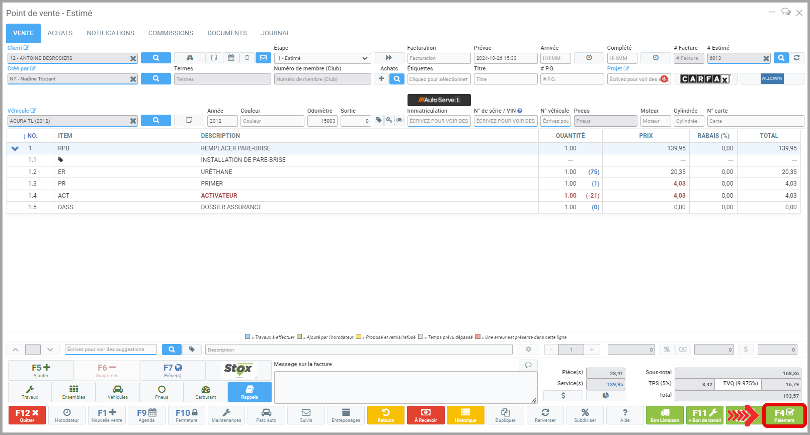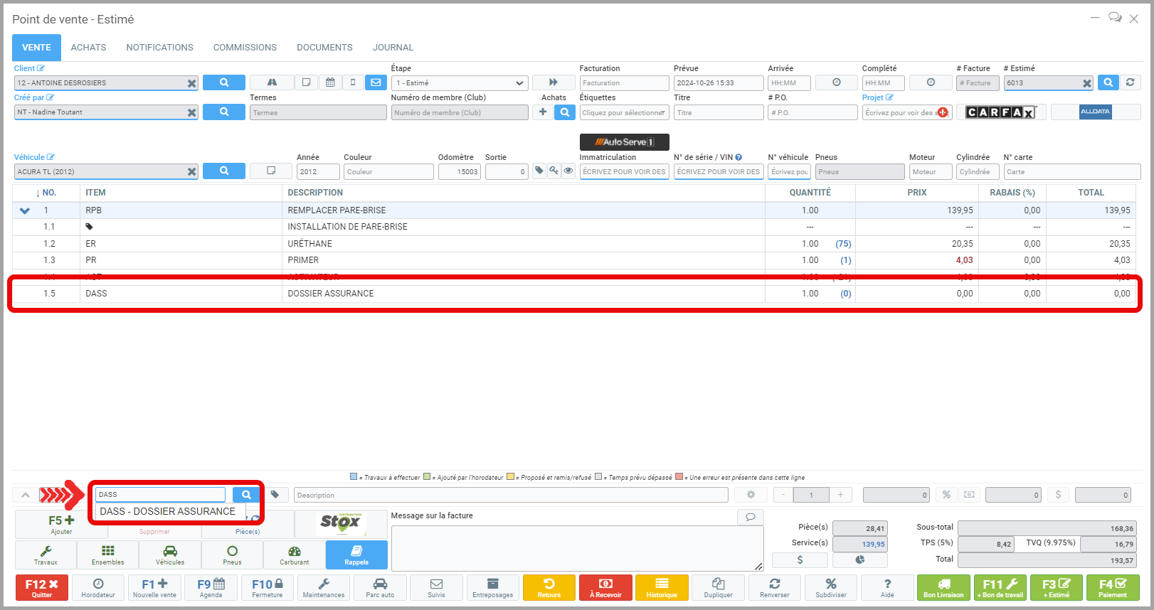 À partir du Point de Vente, complétez l'estimé avec les travaux et pièces requis pour la réparation.