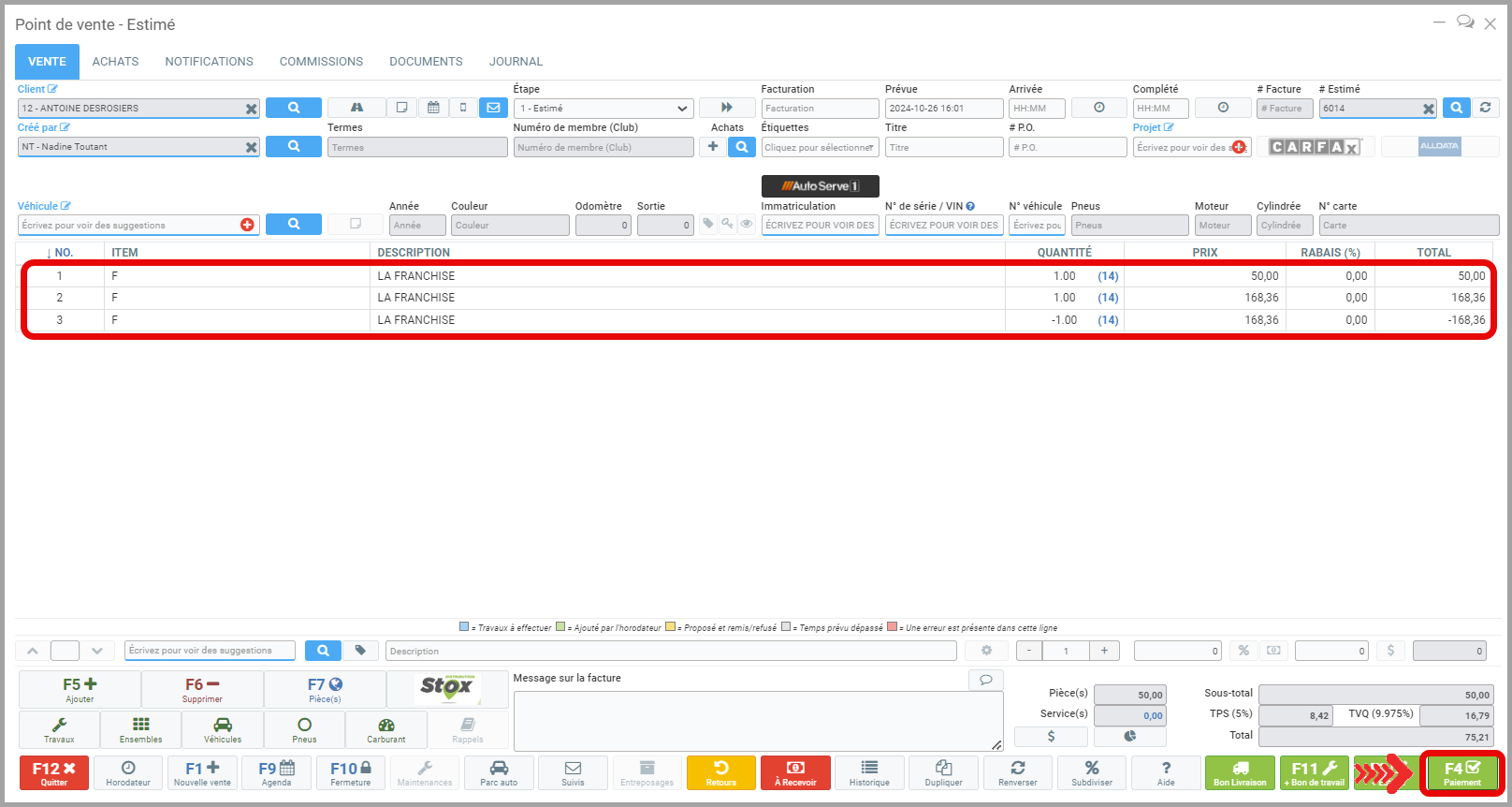 Constatez que 3 lignes apparaissent sur le nouvel estimé. La première correspond à la franchise. La 2e, au montant de la facture pour laquelle la franchise est payée, et à la 3e, le montant de la facture de la ligne 2 est annulé puisqu'il sera payé par l'assureur.