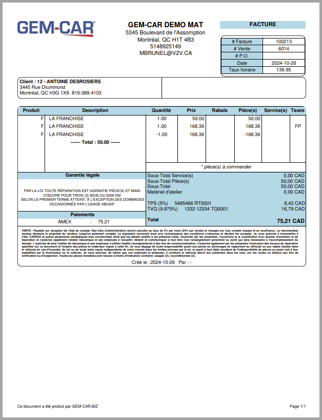 Cette facture est destinée à l'assureur. D'ailleurs, c'est pour cette raison que le montant de la franchise payée par client apparait négativement sur la facture afin que celle-ci ne soit pas payée en double.