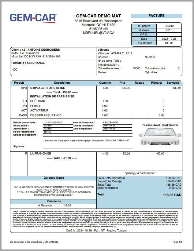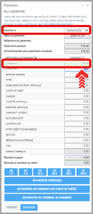 Notez que la facture est automatiquement déposée dans les comptes à recevoir de l'assureur.