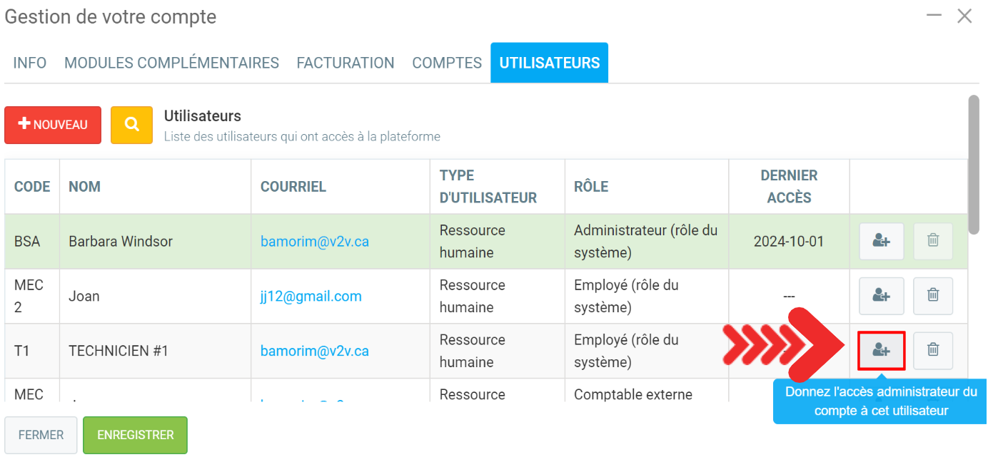 Vous pouvez donner l'accès administrateur du compte à un usager spécifique en cliquant sur avatar+.