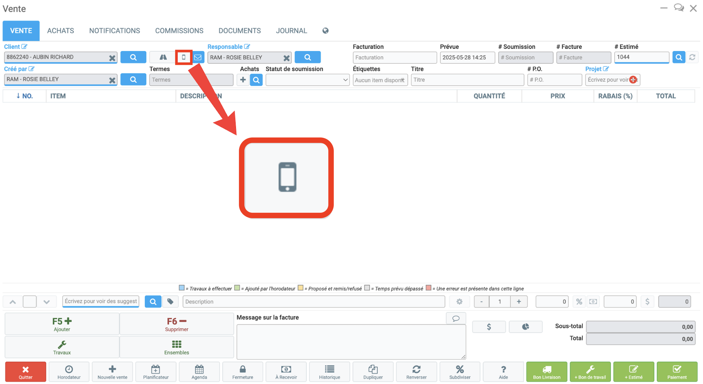 Dans le Point de vente de GEM-WORK, une fois qu'un client a été sélectionné, il est possible de lui envoyer un SMS. Cliquez sur la petite icône de téléphone en haut de l'écran.
