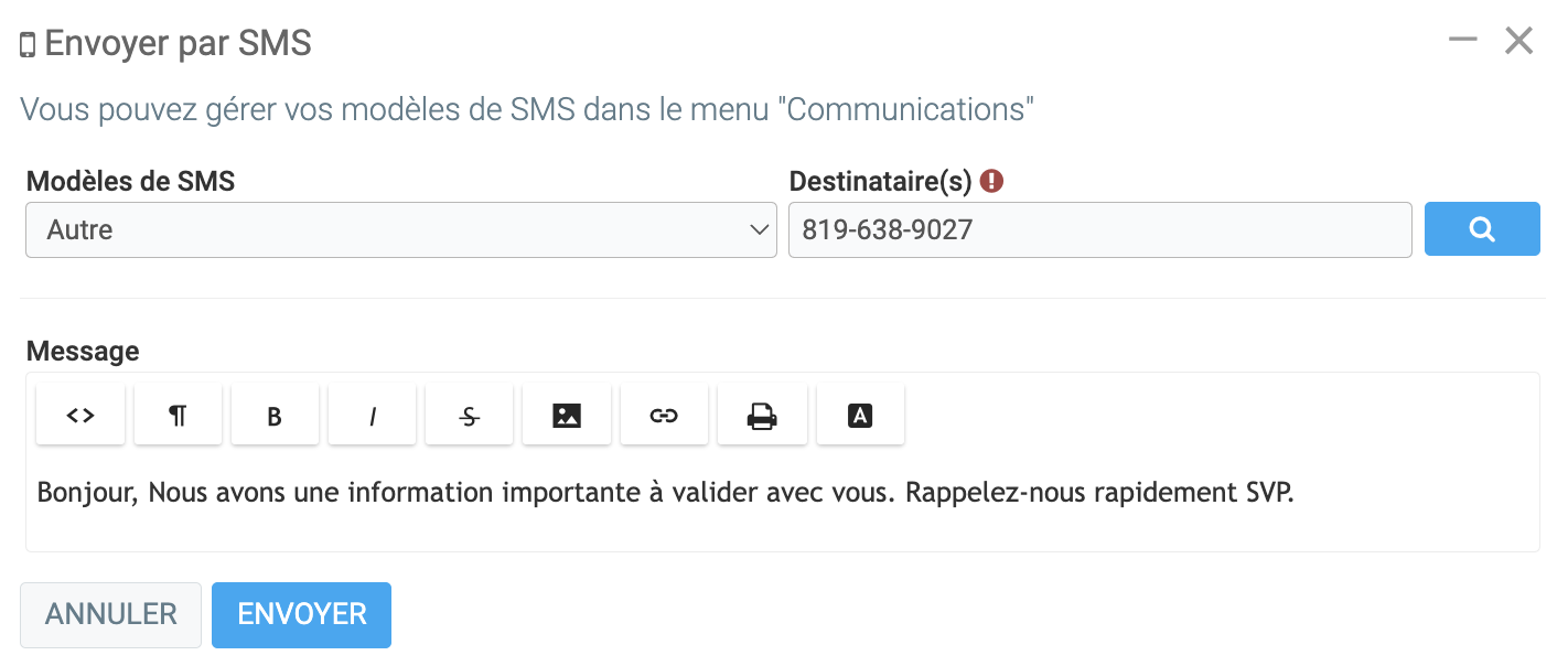 Une fenêtre d'envoi s'affichera à l'écran, sélectionnez le bon modèle, dans ce cas, la boutique aimerait que le client les contacte, saisissez le numéro de téléphone ou utilisez l'outil de recherche à côté du champ. Modifiez uniquement les champs obligatoires dans le message. Une fois les informations prêtes à être envoyées, cliquez sur le bouton bleu envoyer.