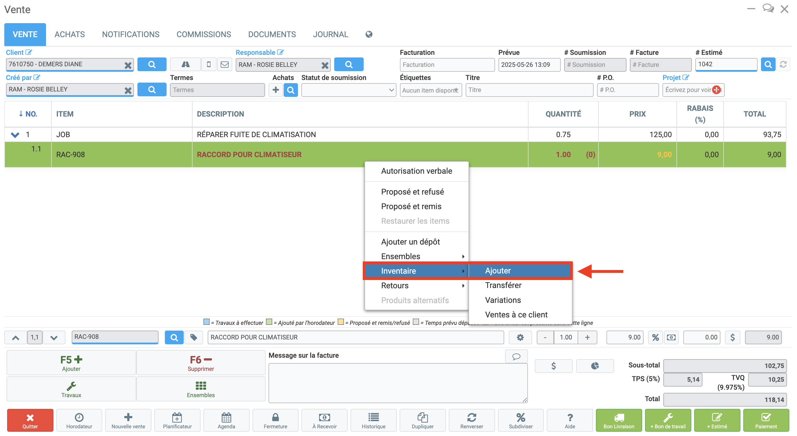 Cliquez ensuite sur le Produit avec le bouton de droit de la souris, sélectionnez Inventaire, et Ajouter.