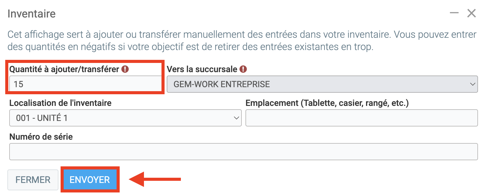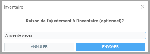 Inscrivez la quantité que vous souhaitez ajouter à l'inventaire et la raison le cas échéant.