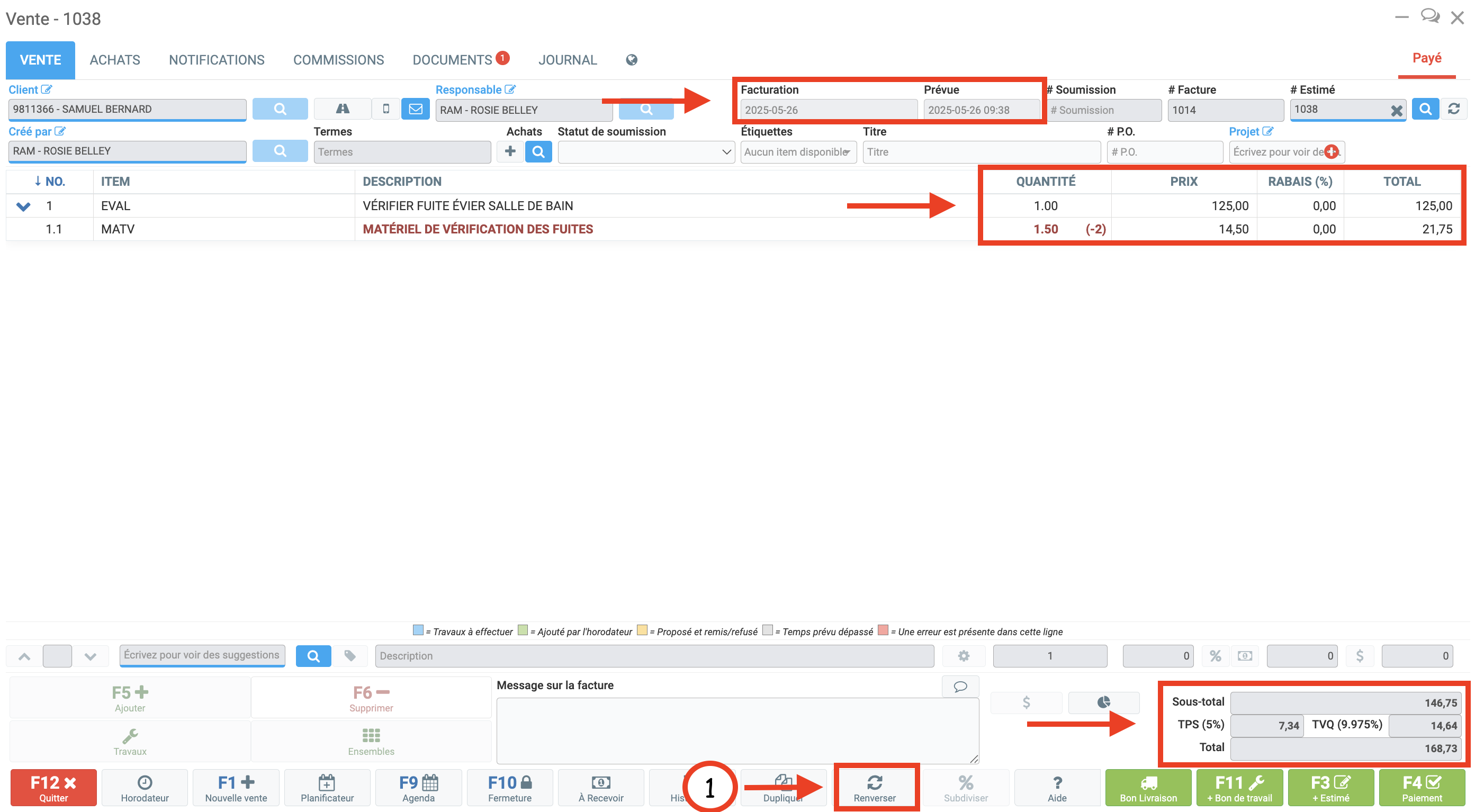 Après chaque renversement factures, il faut faire le bouton paiement afin de finaliser la vente de renversement.