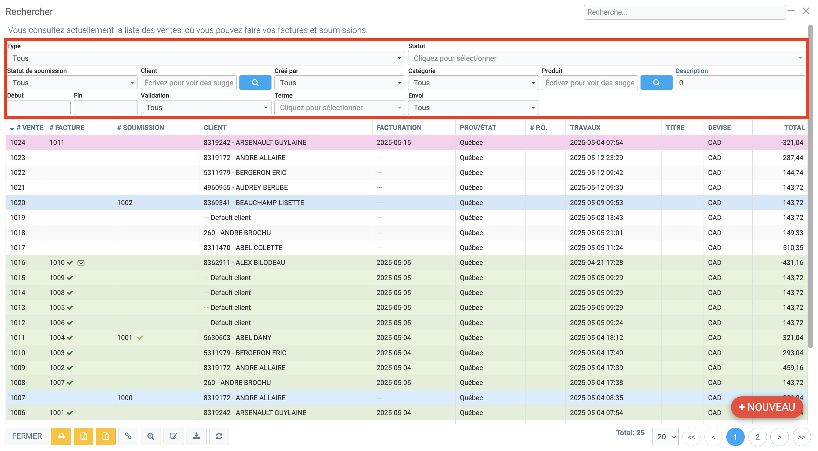 L'utilisation de l'outil de recherche peut être un excellent moyen de filtrer les clients et de trouver des estimations.