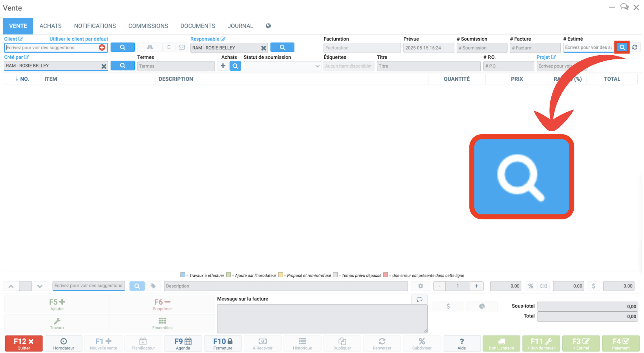 Dans la fenêtre du Point de vente, cliquez sur la loupe bleue à côté du champ estimé.