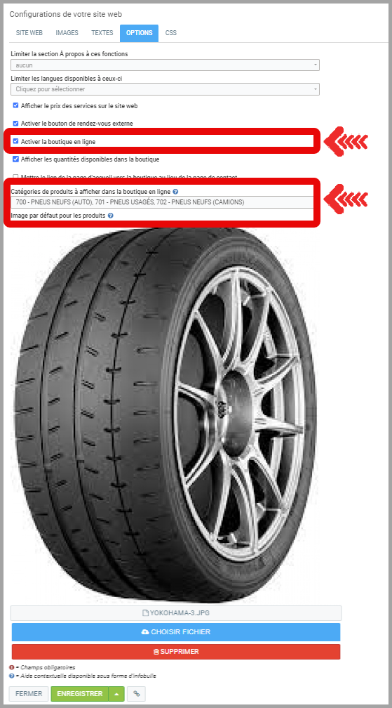 - Choisissez les Catégories de produits à afficher dans la boutique en ligne. La boutique peut être utilisée UNIQUEMENT pour la vente de pneus.
