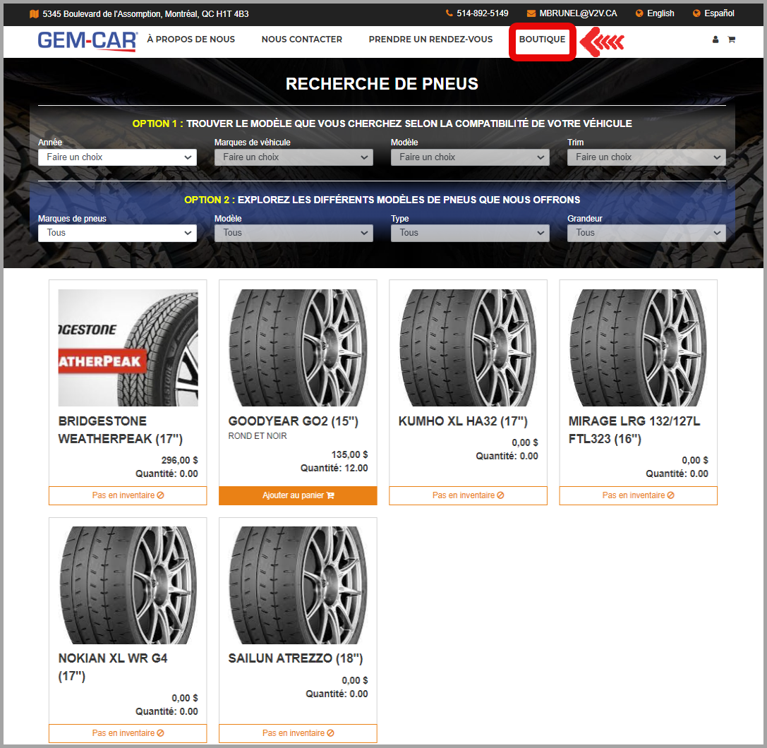 - Sélectionnez ensuite Boutique pour voir les pneus à vendre dans votre boutique en ligne.