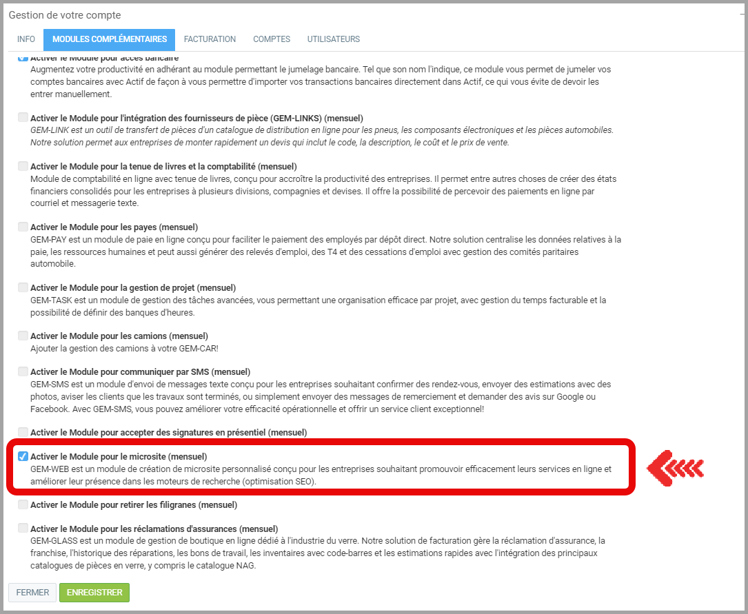 Sélectionnez Activer le Module pour le microsite (mensuel).
