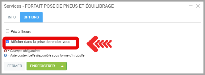 Afin que le Service soit proposé pour la prise de rendez-vous en ligne pour les clients, dans l'onglet Options, sélectionnez Afficher dans la prise de rendez-vous.