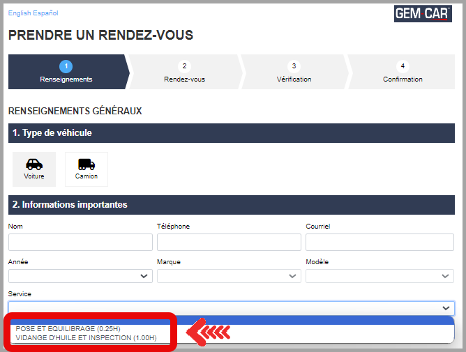 Le client peut dorénavant prendre rendez-vous pour le service configuré.