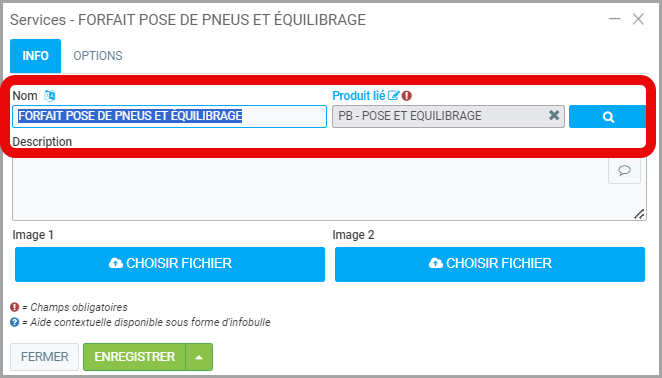 - Entrez les informations sur le service. Le Nom choisi apparaîtra de la même façon sur le site internet. Le Produit lié est important puisqu'à s'agit de celui répertorié dans la section Produits et Services et que c'est celui qui sera en fait facturé.