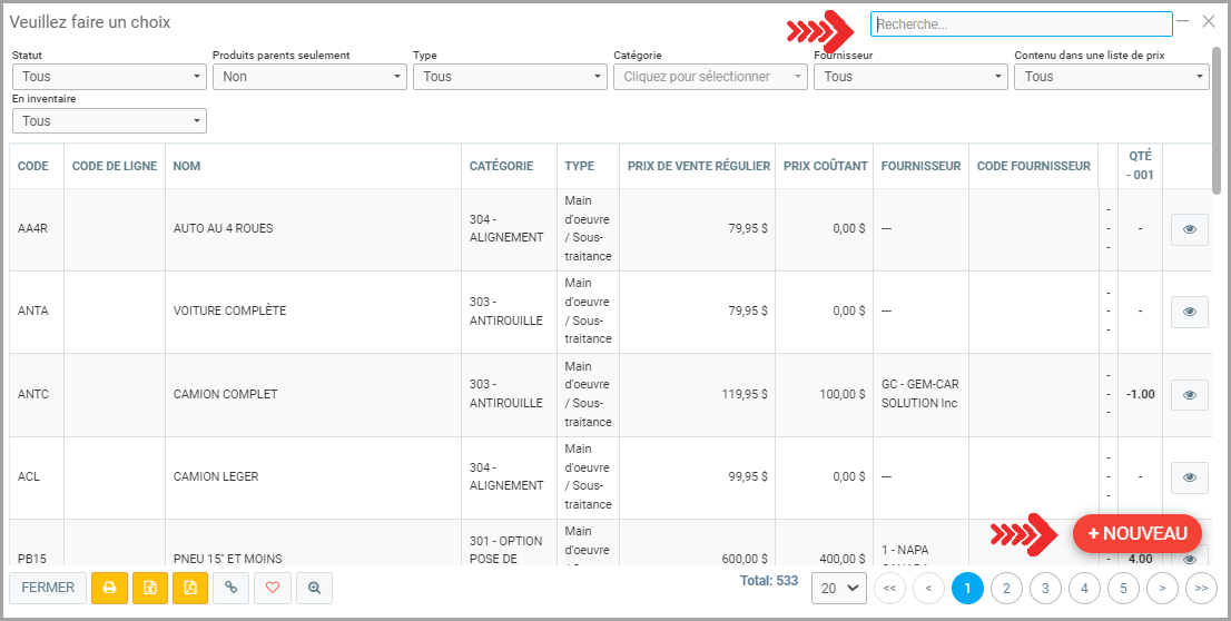- Cliquez sur la loupe pour trouver le produit dans la liste ou en créer un nouveau.