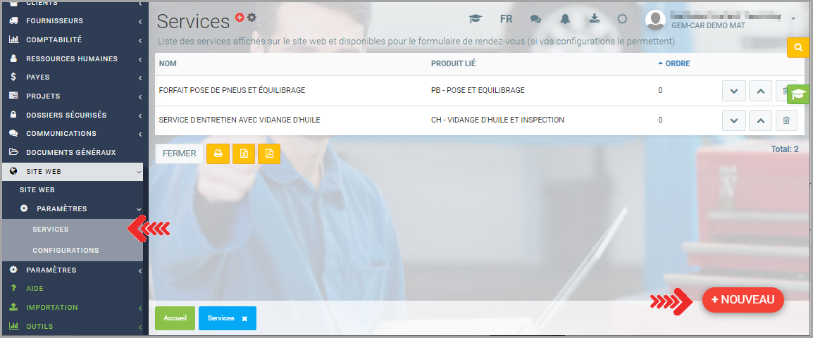 Configuration/ création des services à afficher sur le site web pour la prise de rendez-vous