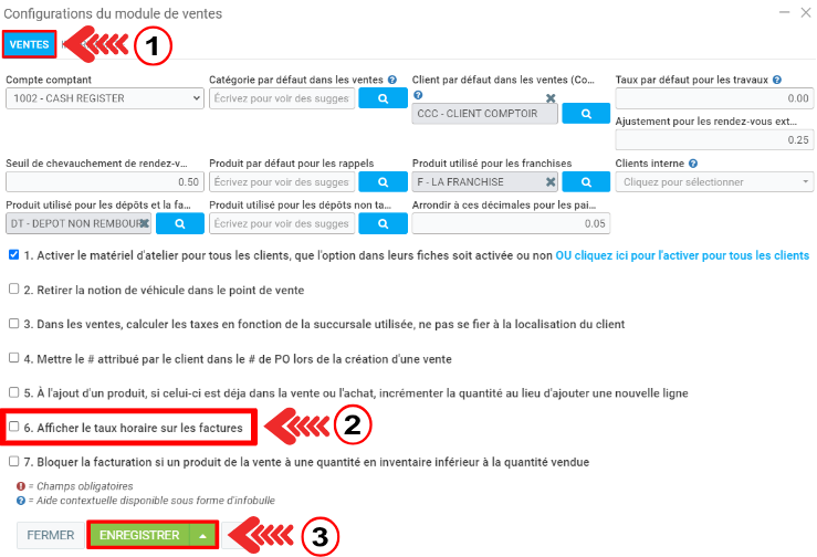 Dans l'onglet Ventes, cochez la case "Afficher le taux horaire sur les factures".