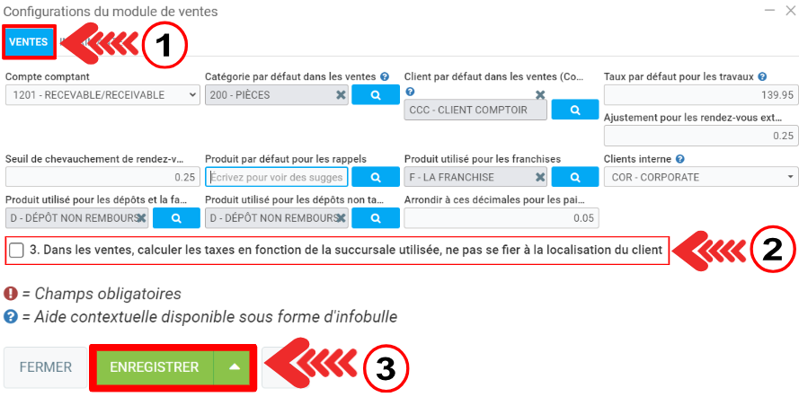 Dans l'onglet Ventes, recherchez et cochez l'option ''Dans les ventes, calculer les taxes en fonction de la succursale utilisée, ne pas se fier à la localisation du client''.