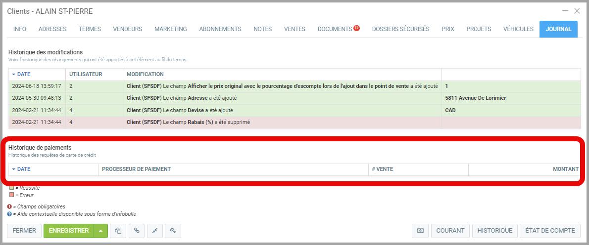 Toutes les erreurs de processeur de paiement se trouvent dans les onglets Journal de la fiche du client et de la vente concernés.