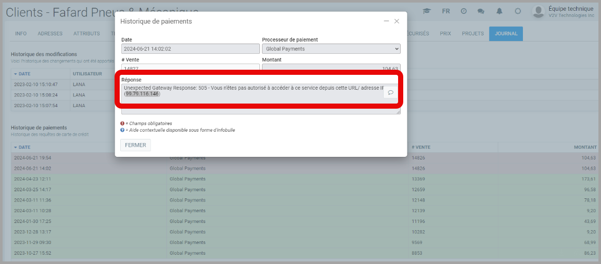 Il faut savoir que le compte Global Payments est sécurisé par IP. Si le message d'erreur suggère que vous ne soyez pas autorisés au service depuis une adresse IP (Exemple: 99.79.116.146), il suffit de l'ajouter aux IPs autorisés sur votre compte Global Payments. Contactez votre fournisseur de service pour des précisions additionnelles.