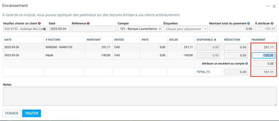 Éventuellement, lorsque le client va vous payer le solde de la facture ou dit autrement, lorsque vous ferez votre encaissement, cochez comme "payer" la facture, le dépôt original, le remboursement du dépôt et le tout devrait correspondre au paiement que vous avez reçu.
